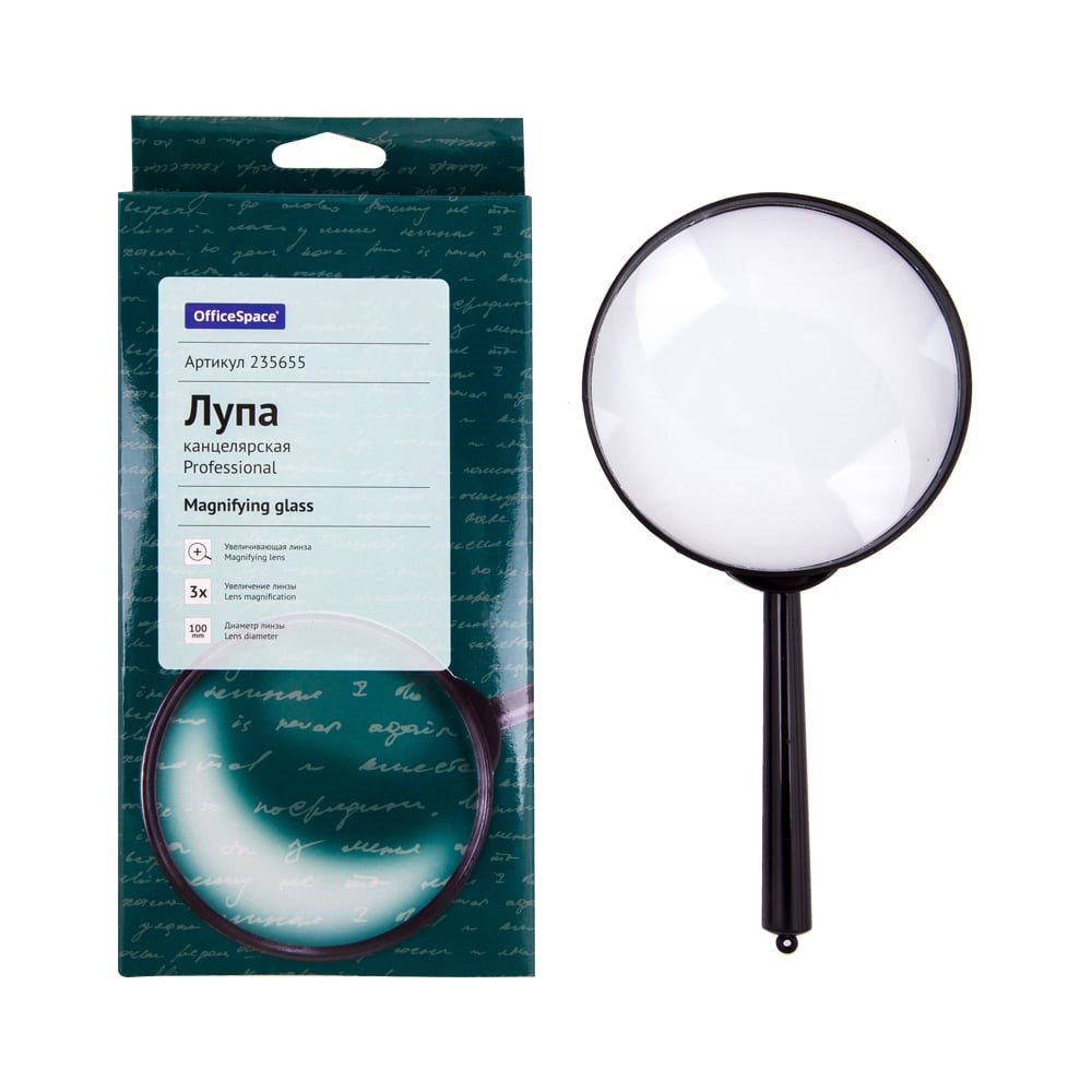Лупа OfficeSpace 100 мм, 3-х кратное увеличение, картонная коробка 235655 оснащена ручкой и предназначена для чтения мелкого текста, рассматривания мелких изображений, схем, графиков, предметов. Для большинства объектов увеличение в 3 раза является оптимальным. Диаметр линзы - 100 мм, что обеспечивает большую площадь обзора. Ручка длиной 120 мм выполнена из пластика, надежно ложится в руку и не выскальзывает.