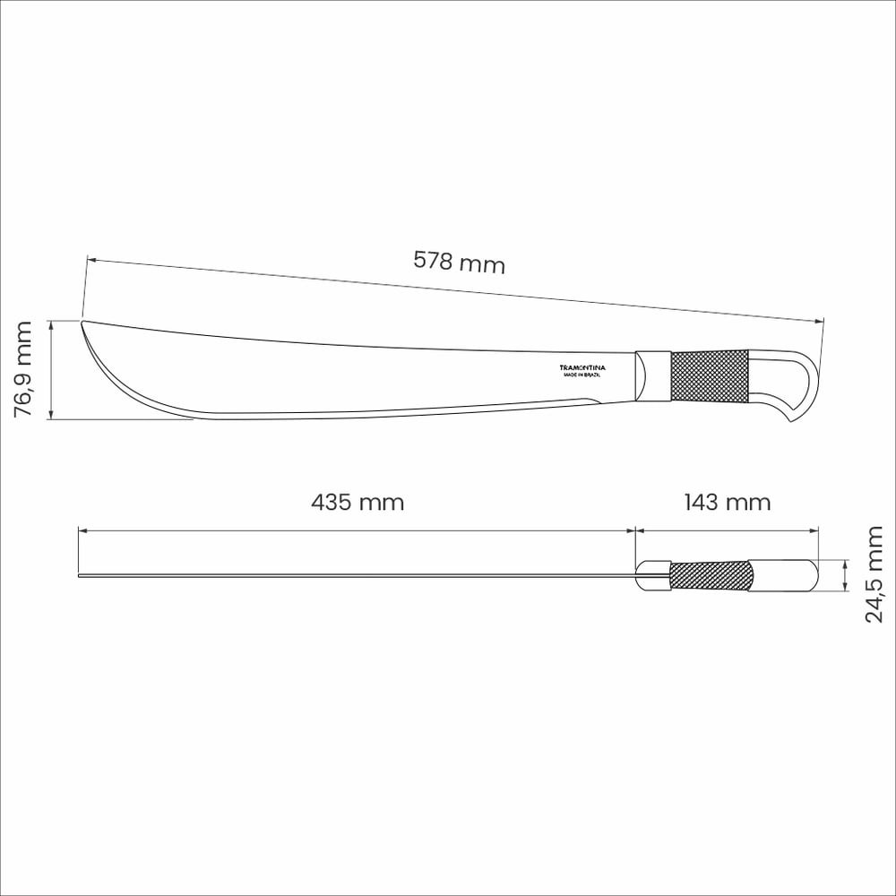 Мачете от TRAMONTINA небольшого размера. Клинок изготовлен из углеродистой стали SAE 1070. Лезвие покрыто лаком для дополнительной коррозийной стойкости. Рукоять из светлых пород дерева с оплёткой из лакированной алюминиевой проволоки. Длина лезвия - 426 мм. Лезвие входит в рукоять на 85 мм. Толщина клинка - 2 мм. Рукоять - 142 мм. Толщина лезвия - 2 мм.После использования хранить в сухом месте.