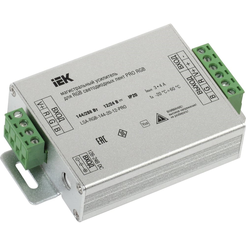 Магистральный усилитель IEK PRO RGB 3 канала 12В, 4А, 144Вт LSA-RGB-144-20-12-PRO предназначен для увеличения мощности питания RGB лент. С помощью прибора и RGB-ленты можно создавать подсветку различных цветов. Конструкцией устройства предусмотрено дистанционное управление.