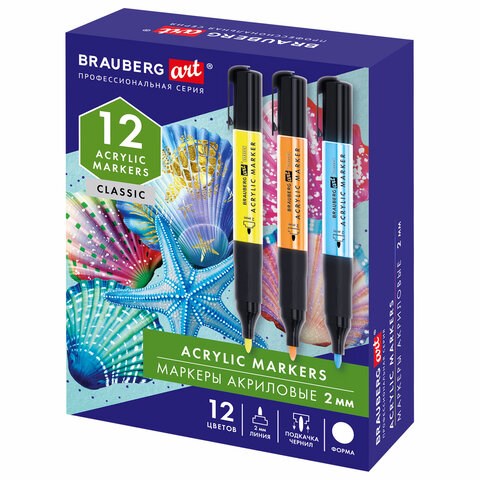 Маркеры акриловые для рисования и хобби, 12 ярких цветов, линия 2 мм, BRAUBERG ART CLASSIC,152519