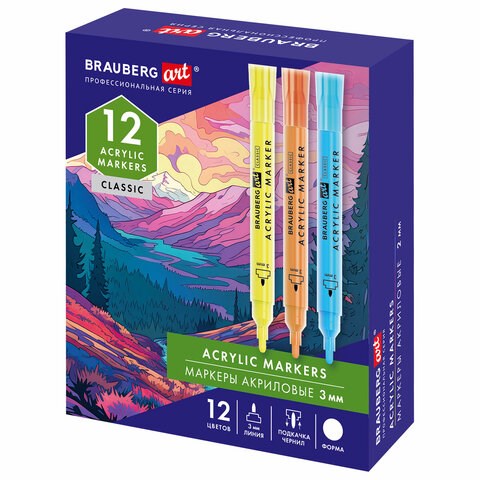 Маркеры акриловые для рисования и хобби, 12 ярких цветов, линия 3 мм, BRAUBERG ART CLASSIC, 152525