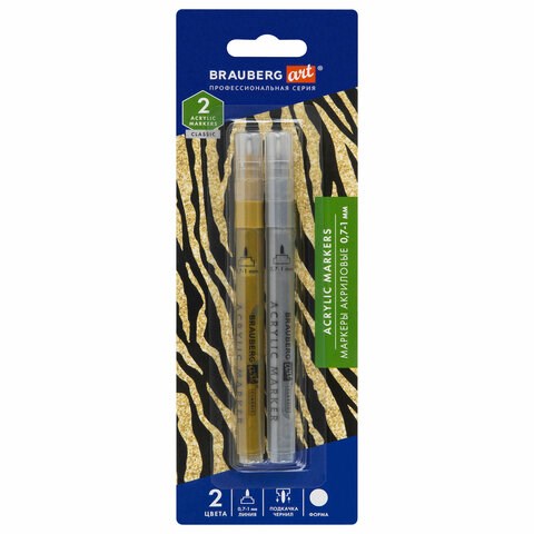 Маркеры акриловые для рисования и хобби, 2 цвета ЗОЛОТО/СЕРЕБРО, линия 0,7-1 мм, BRAUBERG ART, 152528