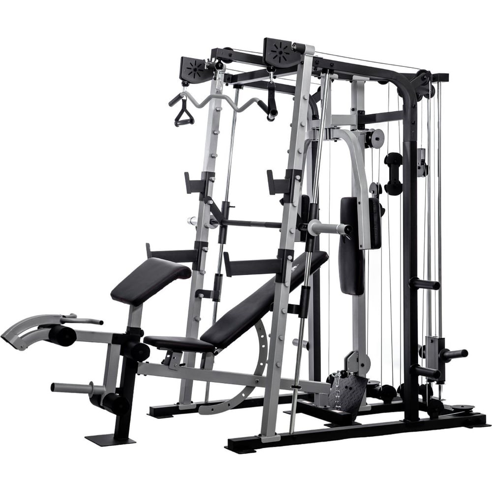 Машина Смита DFC с опциями D6958 предназначен для выполнения различных силовых упражнений: машина Смита, тяга сверху/снизу, баттерфляй, парта для бицепса, сгибание/разгибание, жим лежа на скамье. Изготовлена из прочного стального профиля. Спинка скамьи позволяет отрегулировать угол наклона. Сиденье также регулируется по высоте. В качестве нагрузки используются диски Ø51 мм (опция, приобретается отдельно). Кронштейны для установки штанги и предохранители регулируются по высоте. Для хранения весов (дисков) предусмотрены 4 держателя, посадочный размер 51 мм.