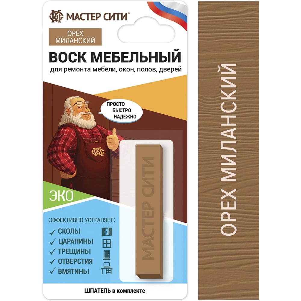Мебельный воск (карандаш) предназначен для ремонта повреждений на мебели, окнах, дверях, напольных покрытиях. Применяйте воск на изделиях из ЛДСП, МДФ, массива дерева, пластика. Воск для мебели улучшает внешний вид мебели, скрывает недостатки, сливается с поверхностью, удобно применять в домашних условиях. Воск мебельный (восковой мелок) легко втирается, прочно и надолго закрепляется в повреждении, устойчив к деформации, не дает усадки и не выцветает со временем. В местах, подверженных динамическим нагрузкам (напольные покрытия, столешницы), дополнительно защитите место реставрации от загрязнения и деформации Лаком быстросохнущим Мастер Сити. Воск для ремонта мебели (восковой мелок) полностью готов к применению, в комплект входит шпатель. Следуйте инструкции на упаковке. Способ применения: Очистите ремонтируемую поверхность от пыли и других загрязнений Затирайте воск в повреждение быстрыми и уверенными движениями. Либо вдавите уголком шпателя небольшое количество воска, одновременно разглаживая на поверхности Излишки воска уберите шпателем. Оставшиеся следы удалите легкими круговыми движениями с помощью стальной ваты или мягкой ткани, стараясь не касаться отремонтированной части Для защиты восстановленного повреждения от загрязнения и деформации, а также для выравнивания степени блеска основной и отремонтированной поверхности, закрепите ремонтное место соответствующим по блеску фиксирующим лаком