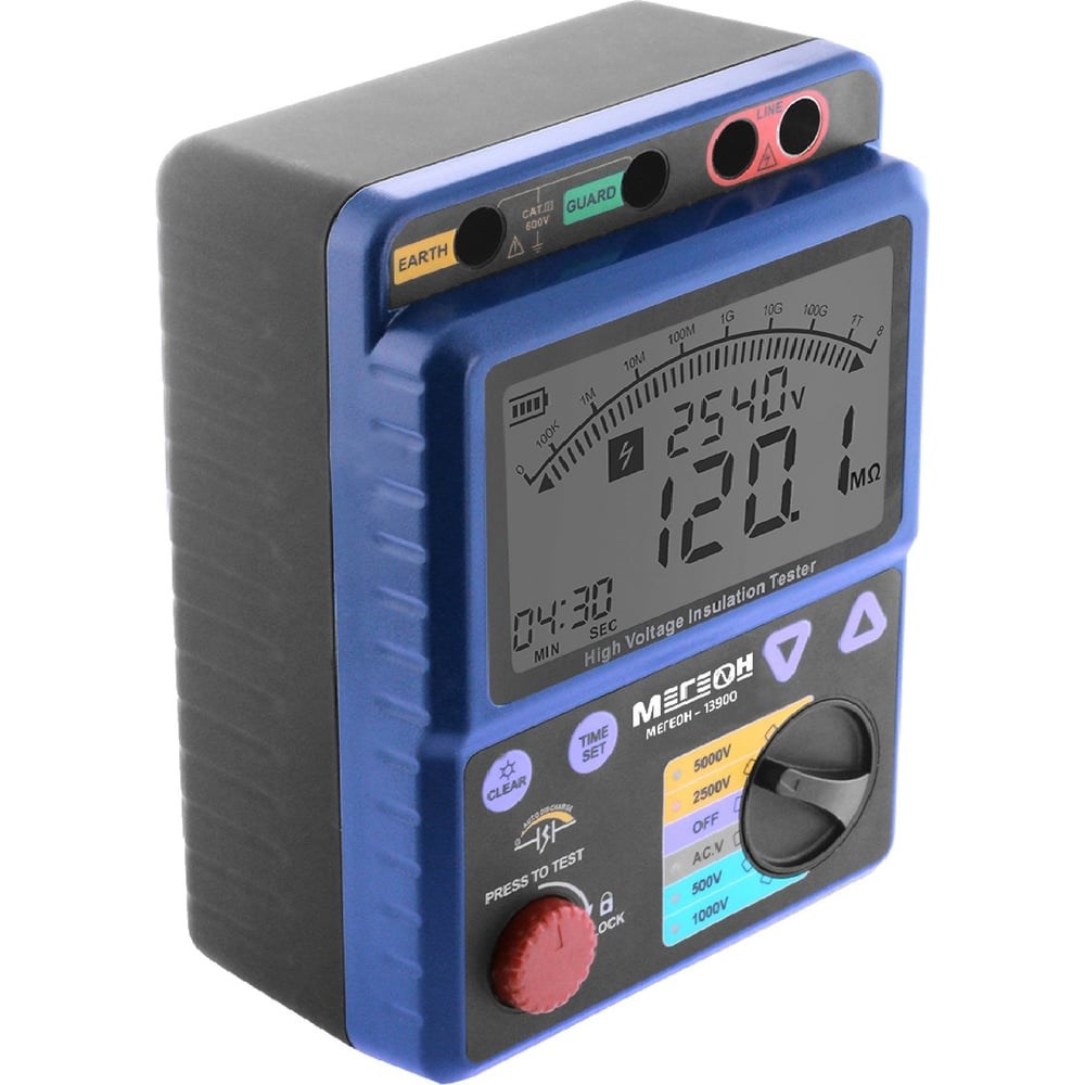 Измеритель сопротивления изоляции – мегаомметр МЕГЕОН 13900 к0000011558 - простой и точный в использовании прибор, предназначенный для измерения параметров сопротивления изоляции, постоянного/переменного напряжения и вычисления индекса поляризации. Дисплей с подсветкой облегчает считывание данных в слабоосвещенных местах. При бездействии более 10-ти минут устройство автоматически отключается, благодаря чему можно экономить заряд батарей. О выходе за верхний предел диапазона измерения сообщает специальный индикатор. Прибор внесен в государственный реестр СИ, под номером 74507-19, срок периодической поверки составляет два года. Тестовое напряжение: 500, 1000, 2500, 5000 В.