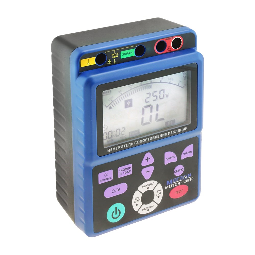 Измеритель сопротивления изоляции - мегаомметр МЕГЕОН 13950 к0000011559 предназначен для проверки сопротивления изоляции и напряжения. Имеет несколько пределов измерения с автопереключением. Большой дисплей с подсветкой облегчает эксплуатацию прибора в слабоосвещенных местах. При длительном бездействии мегаомметр автоматически отключается, экономя заряд элементов питания. Наличие таймера позволяет проводить измерения в течение заданного времени. Прибор внесен в государственный реестр СИ, под номером 74507-19, срок периодической поверки составляет два года.