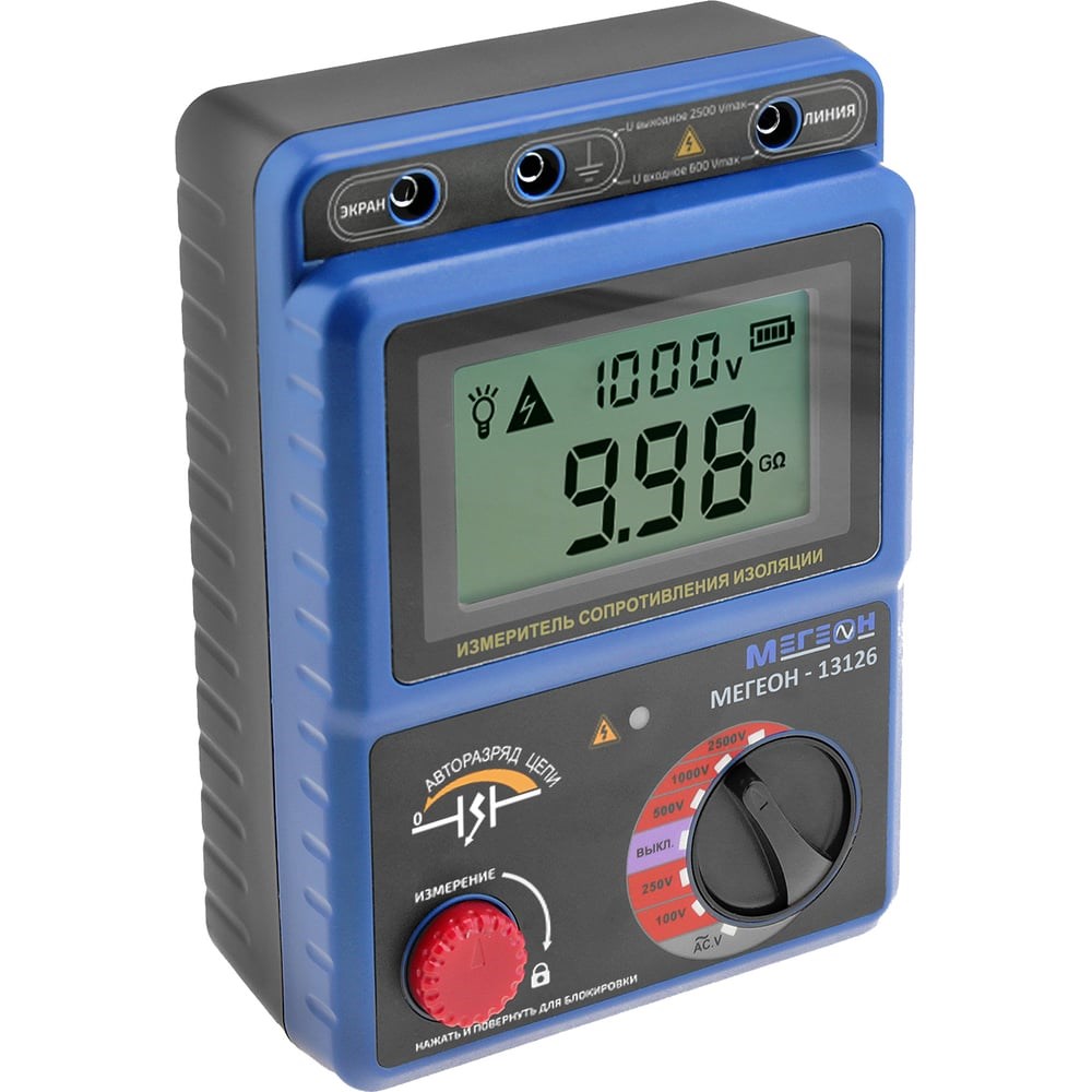 Измеритель сопротивления изоляции – мегаомметр МЕГЕОН 13126 к0000011560 используется для измерения сопротивления изоляции и напряжения. Поддерживает от 2 до 4 пределов измерения с автопереключением. Большой дисплей с подсветкой облегчает считывание данных в слабоосвещенных местах. При бездействии более 10 минут прибор автоматически отключается, что позволяет экономить заряд батарей. Время непрерывной работы составляет 15 часов. Прибор внесен в государственный реестр СИ, под номером 74507-19, срок периодической поверки составляет два года. Тестовое напряжение: 100, 250, 500, 1000, 2500 В.