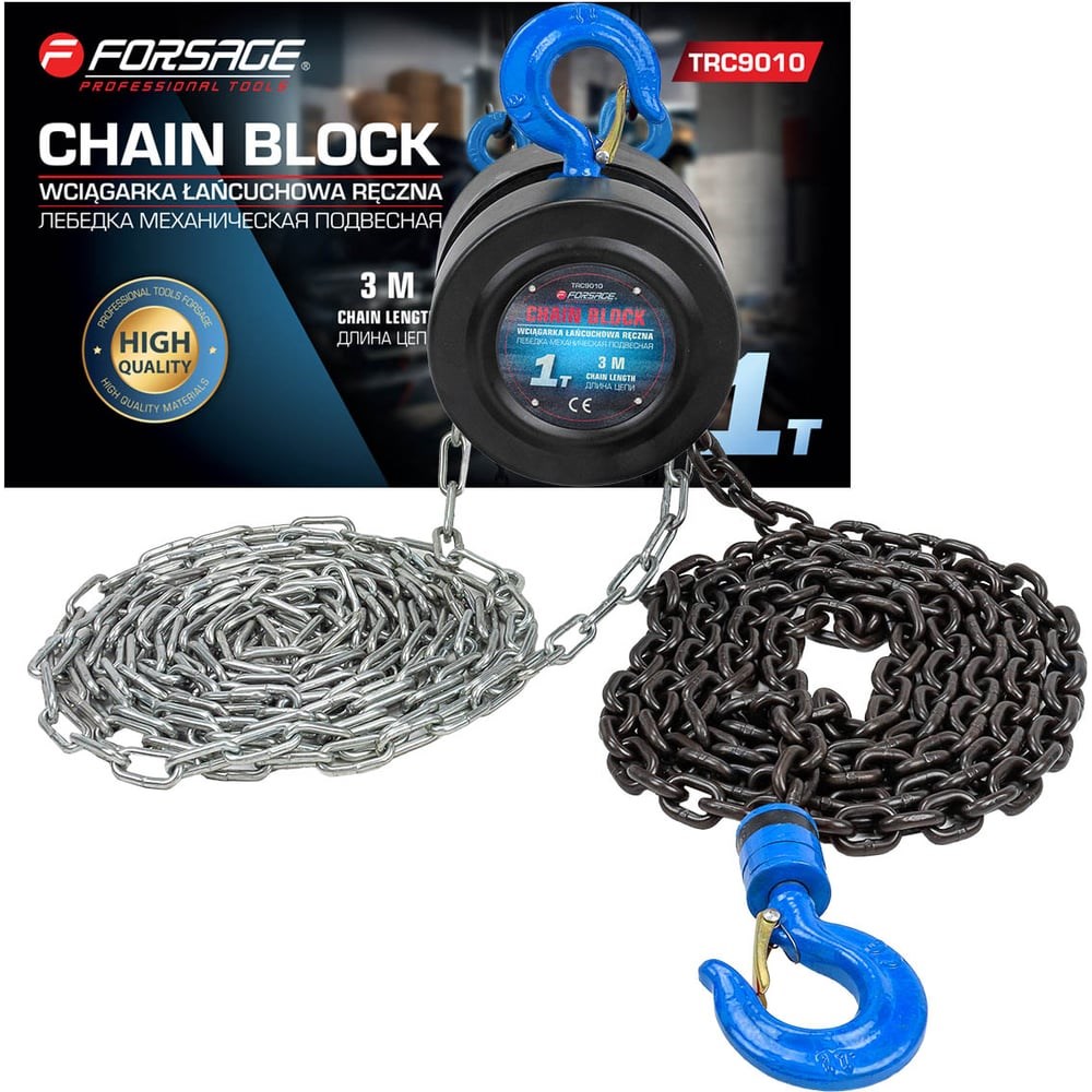 Лебедка механическая подвесная Forsage с фиксацией цепи натяжения — это надежное устройство для подъема грузов с грузоподъемностью до 1 тонны и длиной цепи 3 метра. Эти лебедки, также известные как "тали", представляют собой подвесные грузоподъемные устройства с механическим приводом, которые используют систему блоков и цепей для эффективного подъема и перемещения грузов. Основные характеристики: Грузоподъемность: 1 тонна, что позволяет поднимать разнообразные грузы. Длина цепи: 3 метра, обеспечивающая достаточную длину для работы в различных условиях. Материал: Изготовлена из углеродистой стали, что гарантирует долговечность и надежность. Запас прочности на разрыв: 4:1, что делает цепь крепкой и надежной. Коррозионная стойкость: Устойчива к коррозии и износу, обеспечивая длительный срок службы. Тормоз премиум-класса: Обеспечивает безопасность во время работы. Конструкция Прочная стальная конструкция: Механизм установлен на прочные стальные пластины и закрыт защитным корпусом. Крюки и элементы подвески: Имеют 4-х кратный запас прочности и предохранительную защелку, могут вращаться на 360 градусов, что упрощает работу. Нескользящая рукоятка: Обеспечивает удобство эксплуатации благодаря резиновому покрытию с текстурой. Заключение Лебедка механическая подвесная Forsage — это отличный выбор для тех, кто ищет надежное и эффективное устройство для подъема грузов. С ней вы сможете сэкономить силы и время, облегчая выполнение различных задач!