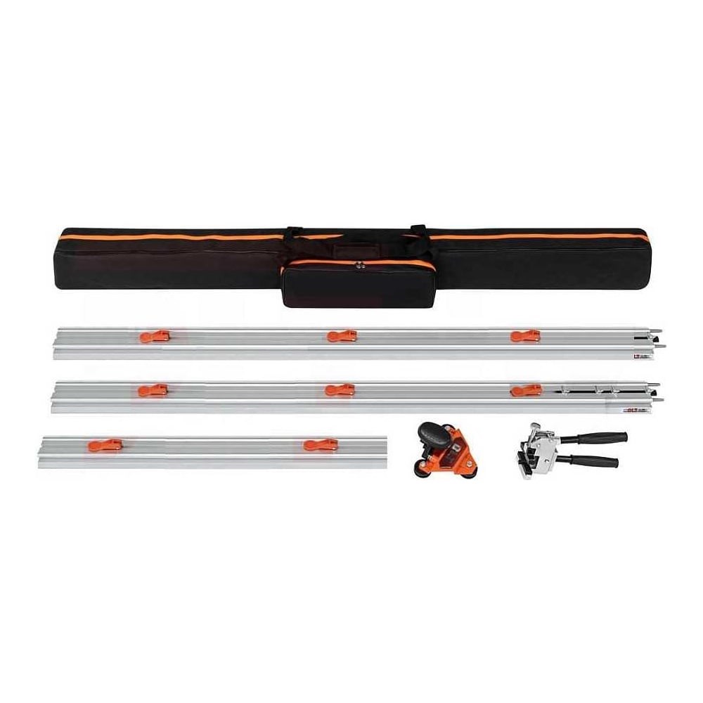 Плиткорез механический DLT Slim Cutter MAX-Plus (Слим Систем Кетер Макс Плюс) специально был разработан для резки керамогранитных плит длиной до 3,8м и толщиной до 15мм. В набор входит: 3 алюминиевых направляющих, две из которых длиной 1.5м и одна длиной 0.8м, 1 каретка с тремя резцами, 1 разделитель плитки, 8 встроенных в направляющие присосок-фиксаторов для гладкой и шероховатой плитки, 1 рычаг для дополнительного усилия и прочный нейлоновый чехол. Направляющие изготовлены из алюминия и собираются между собой для обеспечения идеального разреза всегда с отступом в 1см от края направляющей (т.е. минимальная ширина отрезаемой полоски 1см). Направляющие очень прочные, что позволяет избежать колебаний при резке и делает их неуязвимыми при случайных ударах. Они изготовлены из лёгкого, но очень жёсткого высококачественного алюминия. Направляющая фиксируется на плитке при помощи присосок, которые находятся под ней, что позволяет резать узкие полоски. Каретка с режущим роликами имеет удобную рукоятку-рычаг. Каретка огибает направляющую с двух сторон что способствует отсутствию «перекашивания» при сильном давлении. Режущие ролики из карбида вольфрама с титановым покрытием имеют диаметр 22мм и внутреннюю посадку 6мм. Вся эта система поставляется в прочном нейлоновом чехле.