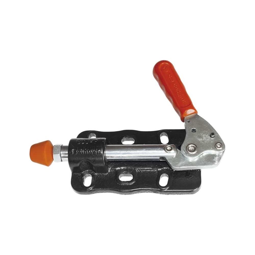 Материалы:Основание литое из прочного чугуна GGG-60.Толкающая штанга, рукоятка и нажимной болт из стали.Заклепки из нержавеющей стали 304.Упор из силикона.Насадка на рукоятку из полиуретана.Исполнение:Чугун покрыт электростатической порошковой краской черного цвета.Толкающая штанга хромированная.Сталь оцинкованная.Втулки закаленные.Ход плунжера: 52 мм.Нажимной винт: M10x70.F1 зажимное усилие: 4500 Н.F3 крепежная сила: 4700 Н.Fi усилие от руки (F1:Fi): 23:1