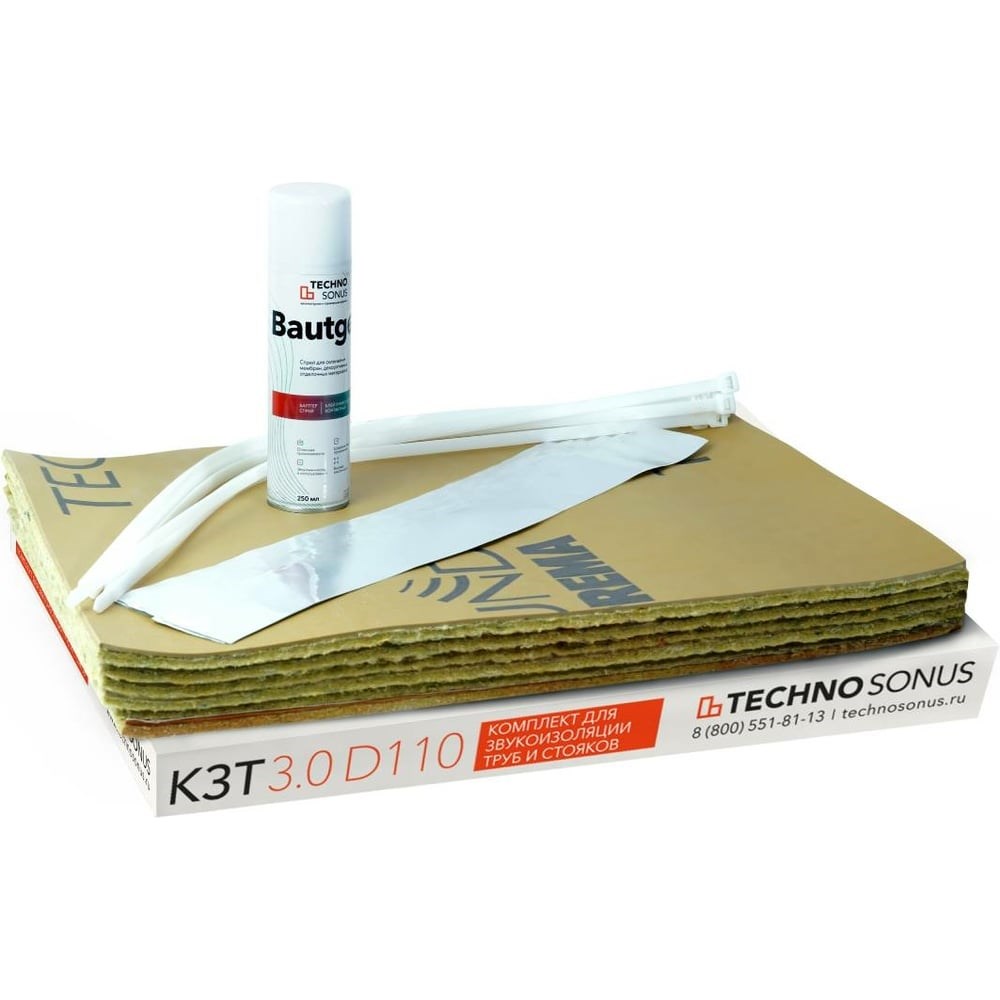 Комплект для звукоизоляции труб 3.0 ТехноСонус D110 1400300171 предназначен для звукоизоляции канализационных труб, стояков, вентиляционных труб, коробов и других трубных коммуникаций диаметром 110 мм (высота трубы до 3 м). Основным элементом набора является комбинированная мембрана, предназначенная для профессиональной звукоизоляции. Материал позволяет добиться высоких показателей по снижению структурного и воздушного шума. Представлен в виде 6 прямоугольных листов размером 500х400 мм.КЗТ 3.0 D110 содержит всё необходимое для выполнения монтажа, дополнительно ничего докупать не требуется.