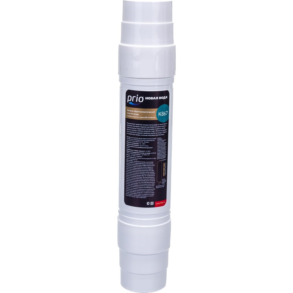 Картридж Prio Новая вода К 867 предназначен для систем обратного осмоса Prio Новая вода Expert Osmos, Praktic Osmos. Обеспечивает очистку воды от солей жесткости, механических примесей, бактерий и вирусов, растворенных органических и неорганических соединений. Картридж состоит из высокоселективной обратноосмотической мембраны из полимерной пленки, благодаря чему улучшается вкус воды и устраняются неприятные запахи. Дополнительные характеристики: рабочее давление: 0.14 - 0.8 МПа (пиковое до 1.6 МПа); температура очищаемой воды: 2-35 °С.