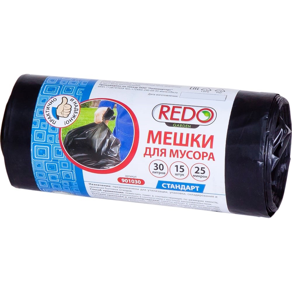Мешки для мусора Standart 15 шт, 30 л, 25 мкм, ПВД, 45x55 см, 180 г REDO 901030 используются для строительных и ремонтных работ, хозяйственных нужд, в офисе, производственных и торговых помещениях, предприятиях HoReCa, индустрии клининговых услуг, красоты и здоровья. Данные пакеты могут быть использованы для сбора и утилизации тяжелого и крупногабаритного производственного мусора, бытовых отходов.