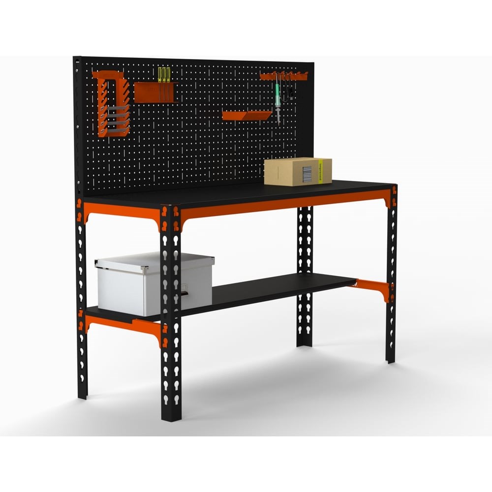 Стол предназначен для удобной организации рабочего места. Модель используется на производствах, на складах, в гаражах, мастерских и на других объектах. Перфопанель с комплектом аксессуаров является дополнительный элементом, который увеличивает рабочее пространство и структурирует хранение инструмента. Толщина перфопанели 0.8 мм. Толщина столешницы - 1.5 мм. Крепление перфопанели: болтовое. Металлический стол отличается практичностью, мобильностью, прочностью и долговечностью в использовании. Крепление элементов стола: безболтовое.Допустимая нагрузка на конструкцию – до 260 кг.