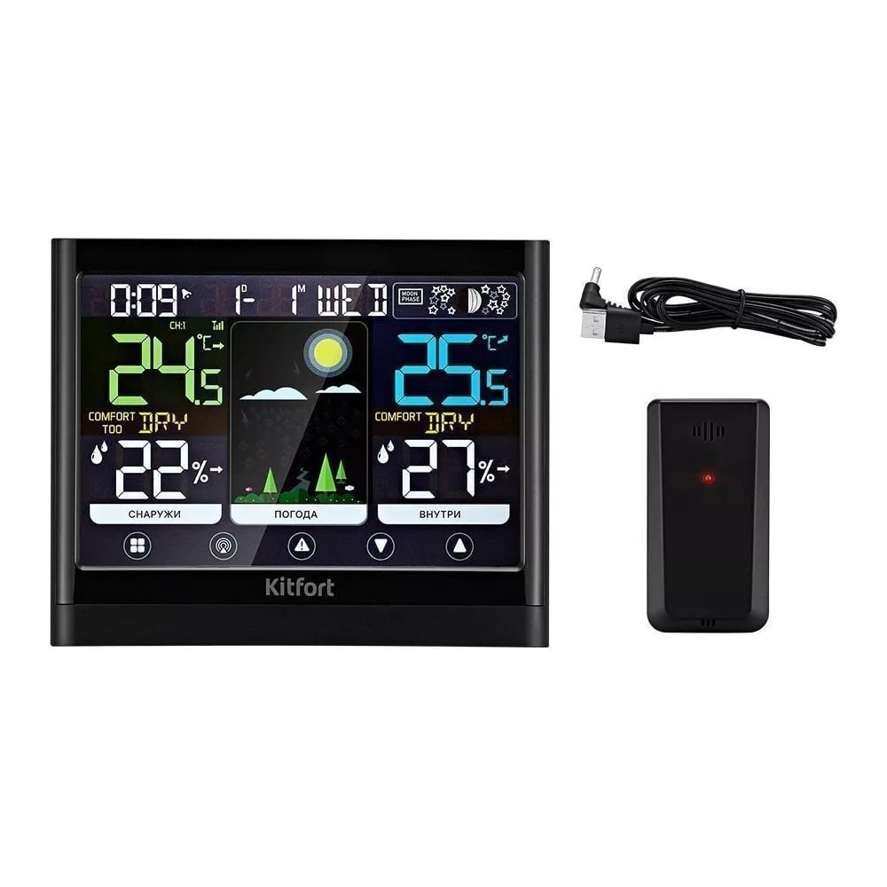Метеостанция KITFORT КТ-3318 – прибор, который позволит следить за показаниями температуры и влажности в помещении и на улице, фазой луны, погодой. Устройство прогнозирует погодные условия на ближайшие 12–24 часа на основе изменения температуры и влажности. Показывает время, дату, день недели, может служить будильником. Сигнал будильника можно отложить на 5 минут. Благодаря стильному дизайну и компактному размеру метеостанция легко впишется в ваш интерьер. Метеостанция обладает цветным экраном, на котором хорошо видны все необходимые значения. Подсветка имеет 3 уровня яркости. Данная модель оснащена одним датчиком, у которого есть отверстие для настенного крепления, чтобы получать показания температуры и влажности снаружи помещения. Питание датчика происходит от 2 щелочных батареек типа AAA (не входят в комплект).