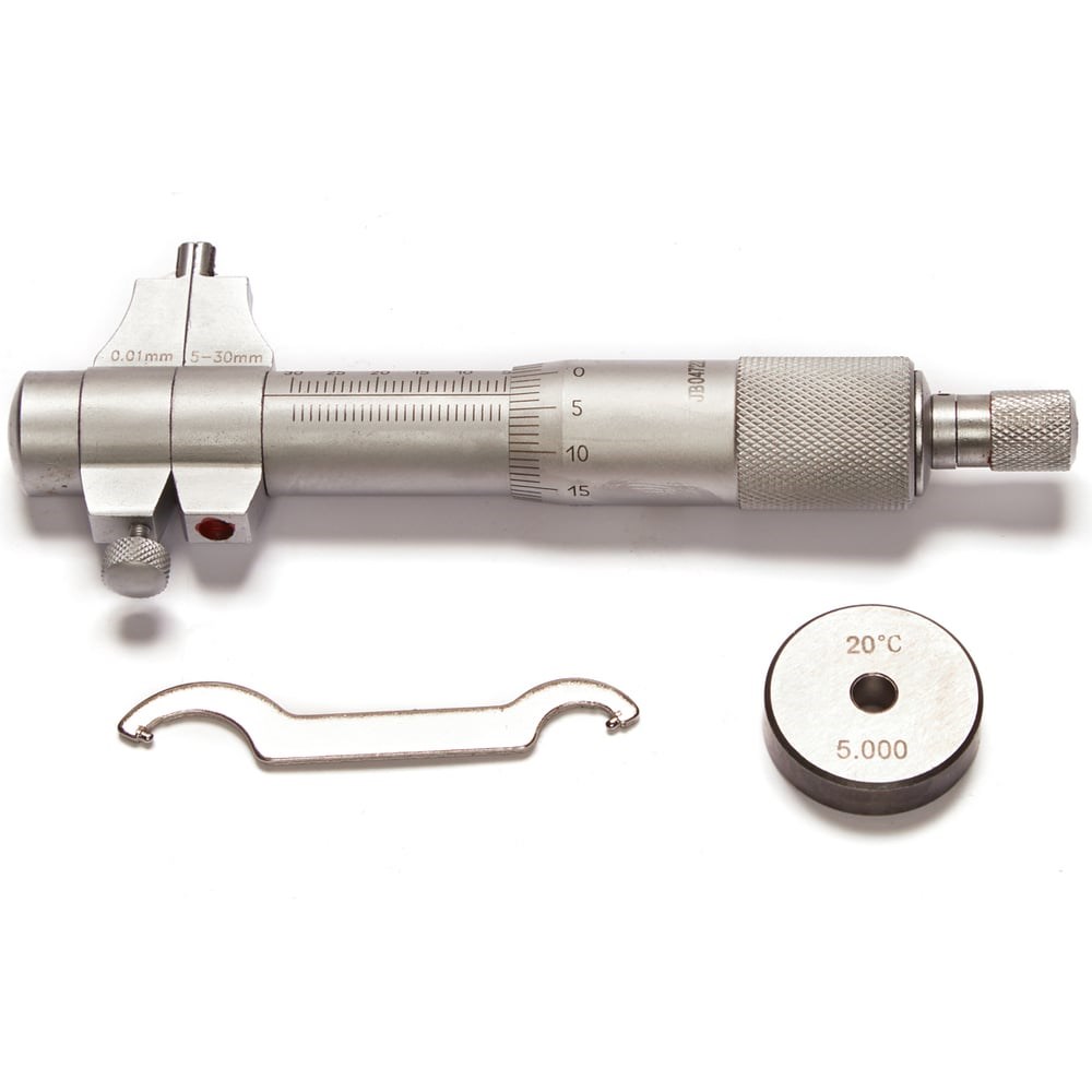 Микрометр (нутромер) для внутренних замеров (с боковыми губками) 5-30 мм ZITOM. ГОСТ 10-88.Универсальный инструмент необходимдля прямых контактных замеров внутренних габаритов деталей, например, трубы или пазас высокой точностью, но с его помощью можно также замерить и внешние габариты. Собственно, само название нутромер прямо указывает, что прибор измеряет, так сказать, нутро, его линейные размеры, но не глубину. Измерительные контактные поверхности имеюттвердосплавныевставки. Калибр-кольцо диаметром 5 мм позволяет проверять точность нутромера. Также нутромер имеет еще одно названиештихмас.