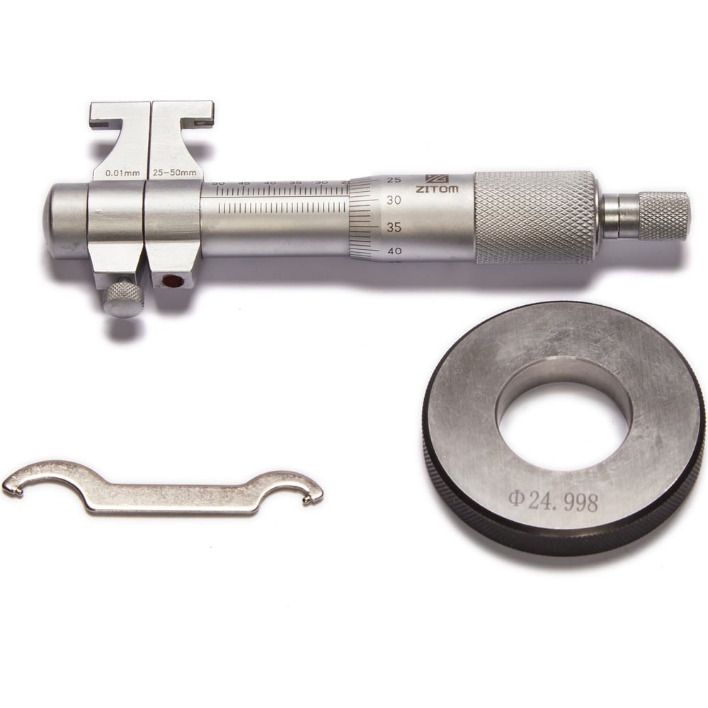 Микрометр (нутромер) для внутренних измерений (с боковыми губками) 25-50 мм ZITOM. ГОСТ 10-88.Универсальный инструмент необходимдля прямых контактных замеров внутренних габаритов деталей, например, трубы или пазас высокой точностью, но с его помощью можно также замерить и внешние габариты. Собственно, само название нутромер прямо указывает, что прибор измеряет, так сказать, нутро, его линейные размеры, но не глубину. Измерительные контактные поверхности имеюттвердосплавныевставки. Калибр-кольцо диаметром 5 мм позволяет проверять точность нутромера. Также нутромер имеет еще одно названиештихмас.