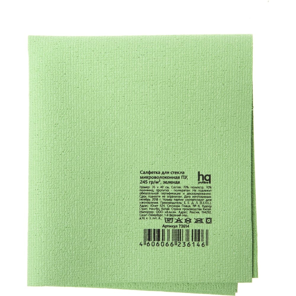 Салфетка HQ Profiline, 35 х 40 см, для стекла, микроволоконная ПУ, зеленая, 73614 подходит для уборки любых типов поверхности, идеально подойдет для стеклянных и зеркальных поверхностей без использования химии.Хорошо впитывает воду, не оставляет разводов, капель и ворса на поверхности. Обладает высокими чистящими свойствами (эффект ластика).Не повреждает убираемую поверхность, хорошо отжимается и выполаскивается от грязи, быстро высыхает после стирки, остается эластичной во влажном и сухом состоянии. Можно стирать в стиральной машине. Износостойкая - выдержит 400 циклов стирки.Салфетка имеет Экспертное Заключение на допуск к контакту с пищевыми средами.
