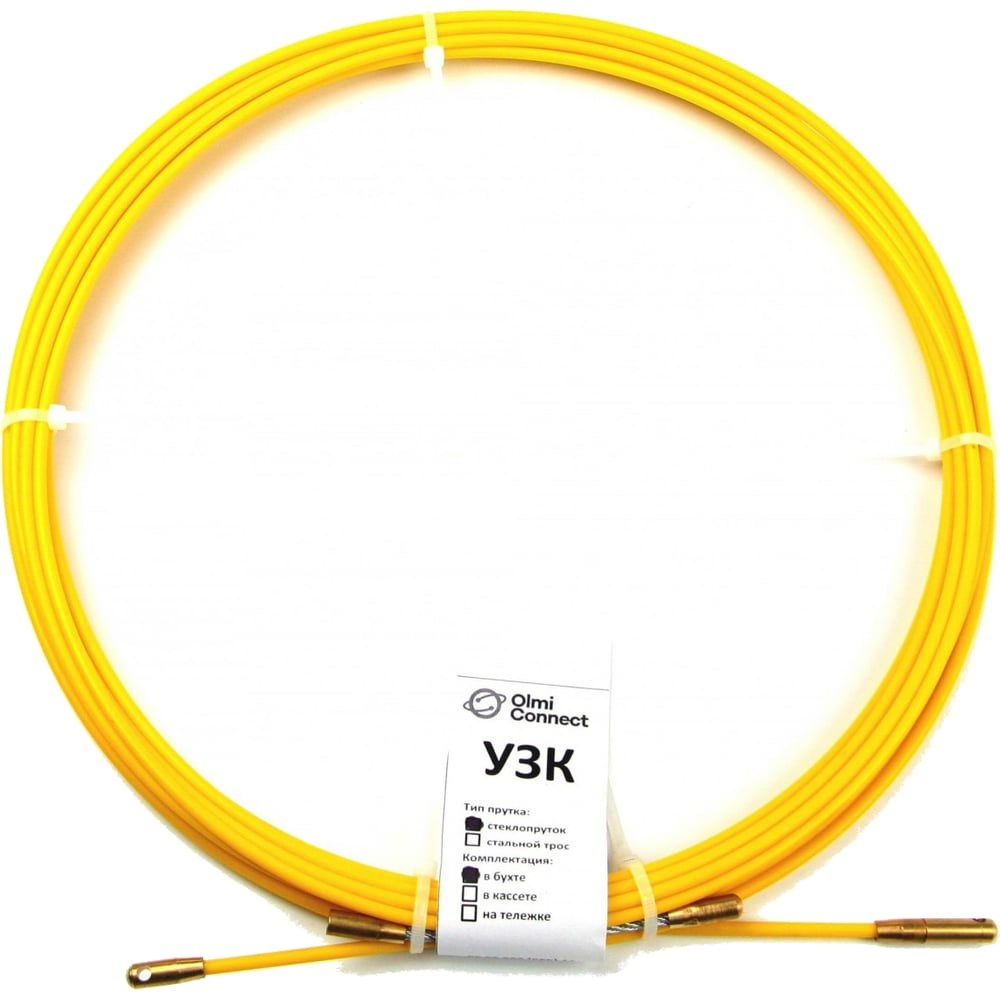Протяжка для кабеля мини OlmiOn УЗК d=4,5 мм L=30 м в бухте, желтый СП-Б-4,5/30 (устройство для закладки кабеля) в бухте - это самое простое, бюджетное, но при этом качественное и надёжное решение проблемы протяжки кабеля в металлорукава, трубы, короба и каналы при проведении монтажных работ по прокладке проводки для установки видеонаблюдения, систем контроля доступа, домофонов, охранной сигнализации, а также линий связи (интернет, телефон) в офисах, жилых и промышленных помещениях. Устройство представляет собой стеклопластиковый пруток (произведённый в Германии), который снаружи покрыт специальной защитной оболочкой, выполненной из износостойкого полиэтилена высокой плотности. С одной стороны УЗК находится наконечник из латуни, на который в каждом конкретном случае, в зависимости от условий протяжки, можно накрутить жёсткую или гибкую насадку (последняя наиболее удобна для использования в каналах уже наполненных большим количеством кабелей или с высоким числом изгибов), а с другой стороны жёстко закреплён наконечник (также из латуни) для фиксации кабеля, который необходимо протянуть. В комплекте с мини УЗК жёсткая и гибкая насадки. Минимальный радиус изгиба протяжки: 25 мм-30 мм. Общий диаметр прутка: 4,5 мм. Поставляются в двух цветовых вариантах на выбор: Желтые, Красные