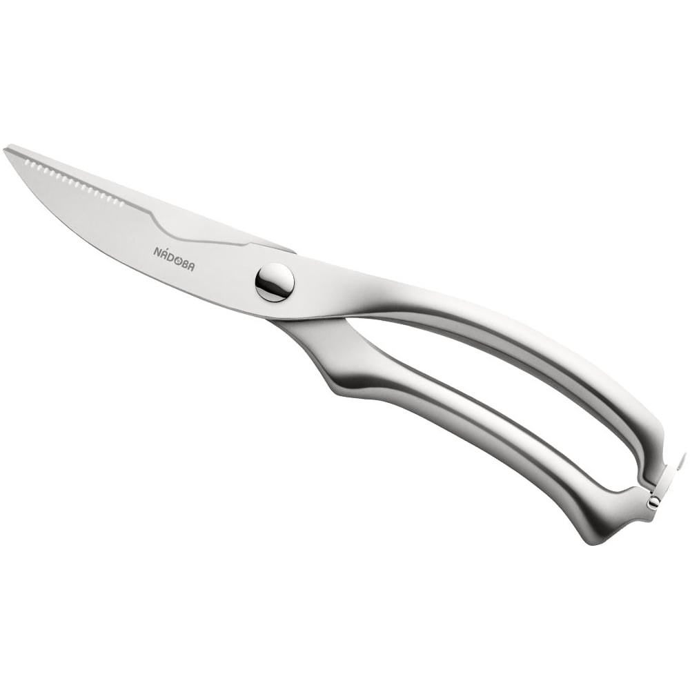 723321 Многофункциональные ножницы для кухни, 25,5 см, стальные, NADOBA, серия BorgaЦельнометаллические многофункциональные ножницы NADOBA 25,5 см серии Borgaвыполнены из высококачественной нержавеющей стали, гарантирующей долгий срок службы. Острые лезвия ножниц устойчивы к коррозии и механическим повреждениям.Многофункциональные ножницы с выемкой для костей будут полезны не только на кухне в качестве разделки любых мясных продуктов, рыбы, курицы, шинковки зелени. Ножницы можно использовать в качестве секатора, так как мощные лезвия легко справляются со стеблями растений толщиной до 20 мм, а специальная зазубренная режущая кромка помогает справиться с волокнистым мясом.Ножницами комфортно пользоваться благодаря пружинной конструкции, которая снижает нагрузку на руку. Механизм фиксации защищает от непредвиденных травм. В сложенном виде изделие занимает меньше кухонного пространства.Можно мыть в посудомоечной машине.Гарантия на многофункциональные ножницы серии Borga 5 лет.