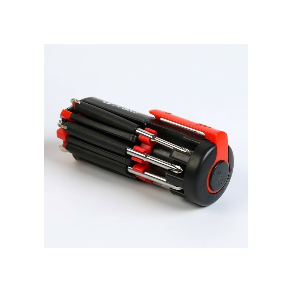 Многофункциональный фонарь Мастер К "Мастер на все руки", 6 LED, 7 отвёрток+фонарь, красный зажим, 4x10 см 7412591 работает от трех батареек типа ААА. Размер - 120х40х40 мм. Мультитут состоит из 7 отверток и фонарика. Поставляется в чехле. Дополнительные характеристики: Источник света: 6 светодиодов мощностью 3Вт. Световой поток: 50 лм. Материал корпуса: прочный ABS пластик. Количество режимов работы: 1.