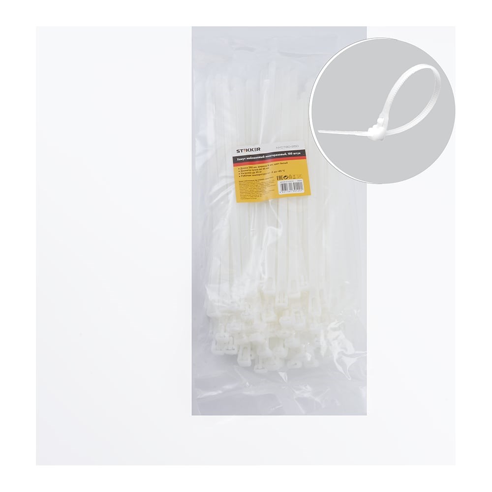 Нейлоновый многоразовый хомут STEKKER 8x250 мм, белый, NYCT80-250 39083