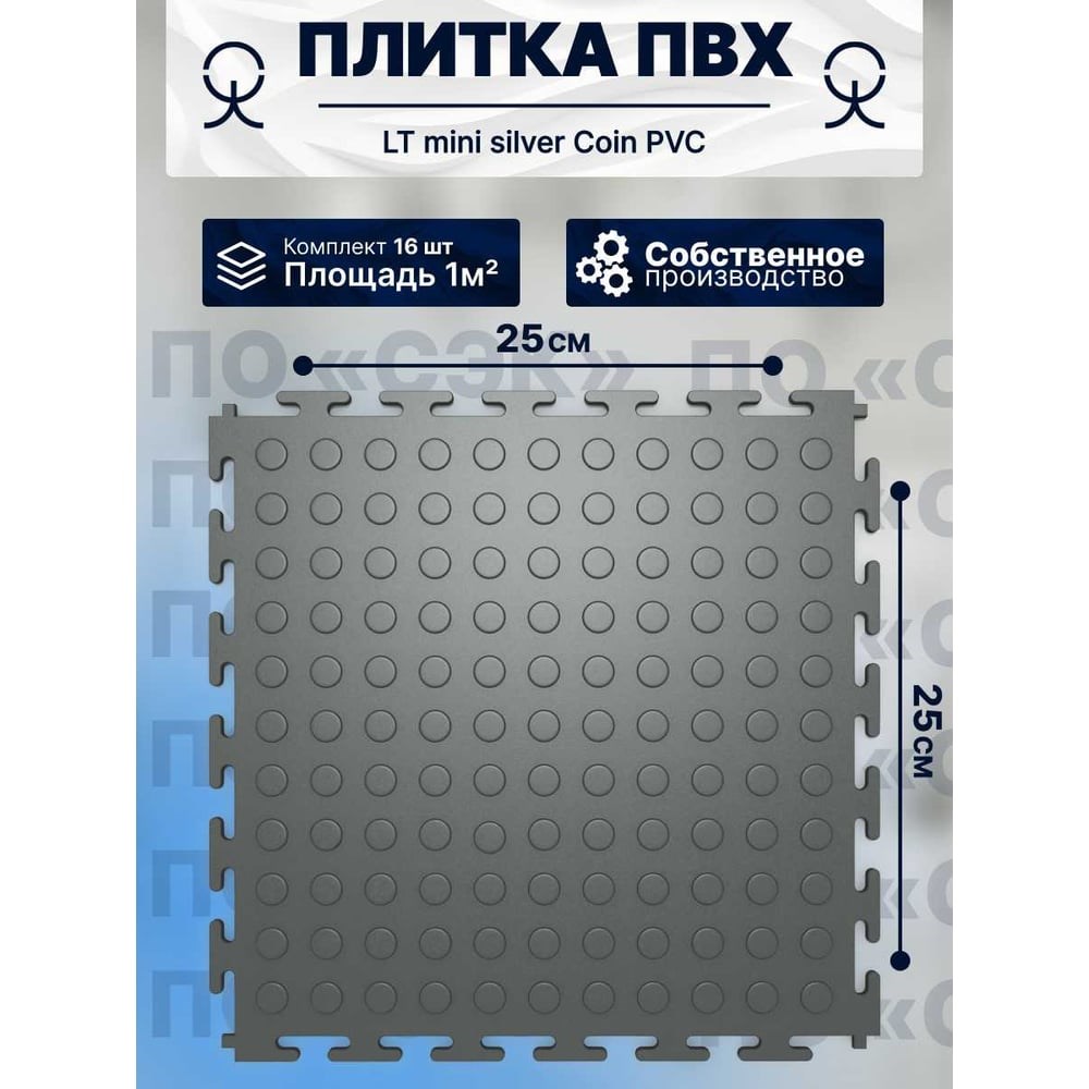 Ищете долговечное, стильное и практичное решение для вашего интерьера? Наше напольное покрытие ПВХ модульная плитка ПО СЭК, LT mini Coin PVC, в 1 упаковке 16 плиток = 1м2, высокого качества идеально подходит для гаража, ванной комнаты, офиса, кухни, дорожки для дачи. Толщина плитки 5 мм, выдерживает до 20 тонн на 1 м2.Для правильной укладки плитки ПО СЭК необходимо соблюдать важные условия. Прежде всего, основание должно быть ровным, твердым и сухим. Кроме того, в некоторых случаях требуется дополнительное приклеивание покрытия к основанию, а именно: - при перемещении по поверхности тяжелой техники (рохли, кары, тележки); - при вероятности обильного проливания воды; - при установке системы теплого пола; - при значительных перепадах температур. Полы можно укладывать вручную, для укладки достаточно иметь деревянный молоток/киянку. Плитка имеет Т-образный замок, что обеспечивает более прочное крепление элементов.Уже сегодня приобретая нашу модульную плитку ПВХ, вы сможете преобразить с лёгкостью свой интерьер! Качество нашего товара подтверждено Сертификатом соответствия RU C-RU.ПБ68.В.01732/23 Перед монтажом ПВХ плитку необходимо занести в помещение за 48 часов до начала работ и распаковать. Особенно важно соблюдать данное правило в холодное время года. Температура в помещении должна быть не менее +15 градусов.