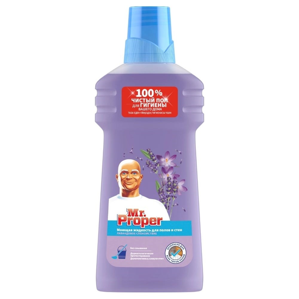 Универсальное моющее средство Mr. Proper с ароматом лаванды упростит ежедневную уборку в доме. Жидкость легко удаляет загрязнения с напольных покрытий, стен, корпусной мебели и сантехники. Придает поверхностям блеск, устраняет неприятные запахи. Особенности средства для мытья полов и стен Mr. Proper: Безопасный состав. Не содержит агрессивных очищающих компонентов, таких как хлор; Удаляет до 100% пятен. Даже в холодной воде средство устраняет въевшиеся пятна на напольных покрытиях, стенах и корпусной мебели; Не оставляет разводов. Средство не оставляет разводов даже на глянцевых поверхностях; 100% чистый пол без смывания. Можно использовать в неразбавленном виде или растворять в воде; Бережность к покрытиям. Cредство подходит для мытья всех типов полов: линолеума, лакированного паркета, ламината, плитки и других твердых поверхностей; Дерматологически протестировано. Средство безопасно для уборки помещений, в которых живут дети и домашние животные; Безопасно для септика. Продукт можно применять в домах, оборудованных септик-системами. Продукт можно использовать в чистом или разбавленном виде в пропорции 2 колпачка на 5 литров воды. Средство не нужно смывать, если вы не обрабатываете поверхности, которые соприкасаются с пищевыми продуктами. Использовать в разбавленном виде для лакированного паркета, ламината и ПВХ. *Не использовать на промасленной и необработанной древесине.