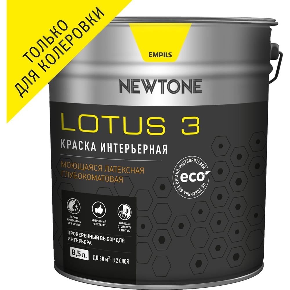 Интерьерная краска Newtone LOTUS 3, ВД, моющаяся, латексная, глубокоматовая, База C NEW, 8.5 л, 11.1 кг 81585 - это высококачественная, глубокоматовая водно-дисперсионная краска на основе базы С применяется для обработки стен и потолков внутри жилых, общественных и производственных помещений. Служит для создания различных цветов глубокоматовой водно-дисперсионной моющейся краски насыщенных тонов в соответствии с программным обеспечением колеровочной системы. Материал можно наносить на большинство минеральных оснований, включая бетон, газобетон, кирпич, гипсокартонные плиты, а также обои, оштукатуренные, ранее окрашенные (но не глянцевые), другие пористые поверхности. Экологически безопасная. Легко наносится, обладает хорошей растекаемостью, что позволяет получить равномерное, гладкое, без следов от валика и кисти покрытие. Образует покрытие, стойкое к мытью. Внимание! База С не применяется без колеровки.
