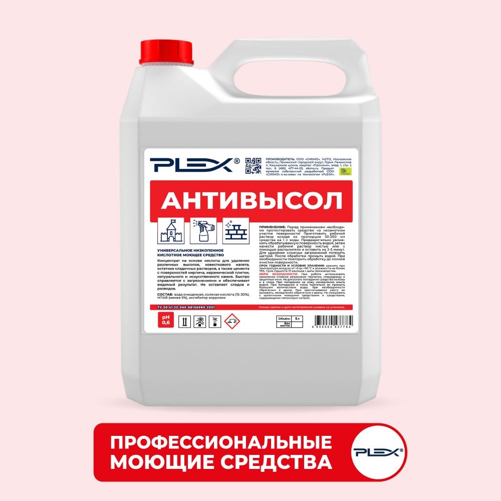 Концентрат на основе кислоты для удаления высолов, известкового налета, и других минеральных загрязнений, в том числе сложных - остатков цемента, ржавчины с поверхностей фасадов зданий. Быстро справляется с загрязнениями и обеспечивает видимый результат. Не оставляет следов и разводов. Способ применения: Перед применением необходимо протестировать средство на незаметном участке поверхности! Приготовить рабочий раствор, исходя из пропорции 30-200 мл средства на 1 л воды. Предварительно увлажнить обрабатываемую поверхность водой, затем нанести рабочий раствор кистью или с помощью распылителя и оставить на 3-5 минут. Для удаления сложных загрязнений потереть щеткой. После обработки промыть водой. При необходимости повторить обработку до полной очистки поверхности. Не смешивать с щелочными моющими средствами и средствами, содержащими гипохлорит натрия. Меры предосторожности: При работе использовать химически стойкие резиновые перчатки, спецодежду и защитные очки. Не допускать попадания средства на кожу и в глаза. При попадании на кожу немедленно смыть водой. При попадании в глаза тщательно их промыть большим количеством воды, при необходимости обратиться к врачу. При проглатывании рвоту не вызывать, немедленно обратиться к врачу. Не смешивать с щелочными моющими средствами и средствами, содержащими гипохлорит натрия.