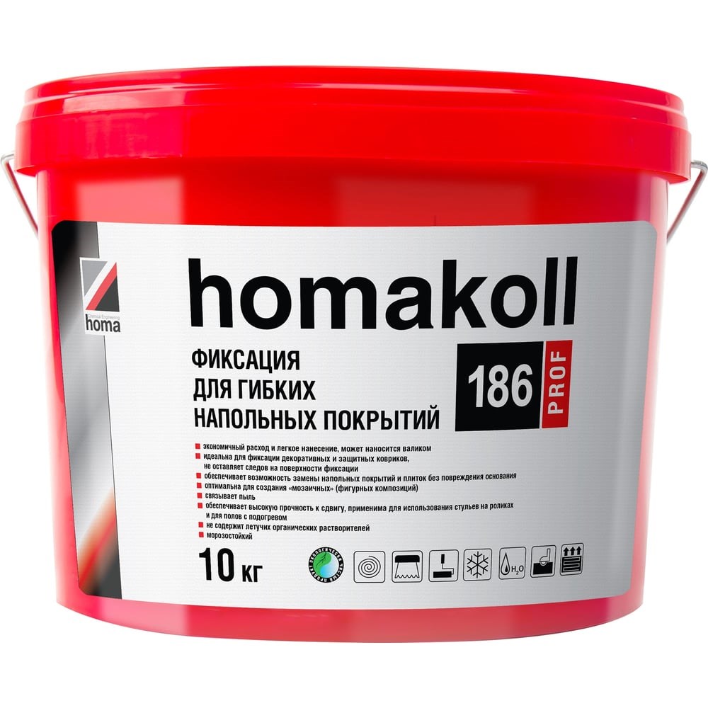 Морозостойкий клей фиксация Homakoll 186 Prof, 100-150 г/м2, 10 кг 115383 используют во время укладки гибких напольных покрытий и приклеивания легких облицовочных плиток (ПВХ, виниловые, ковровые, пробковые, стиропоровые) на впитывающие и не впитывающие основания. Состав подходит для создания "мозаичных" (фигурных) композиций, фиксации декоративных или защитных ковриков на ПВХ, линолеуме, ламинированном паркете и керамической плитке внутри помещений. Продукт позволяет при необходимости легко заменить покрытие без повреждения поверхности.