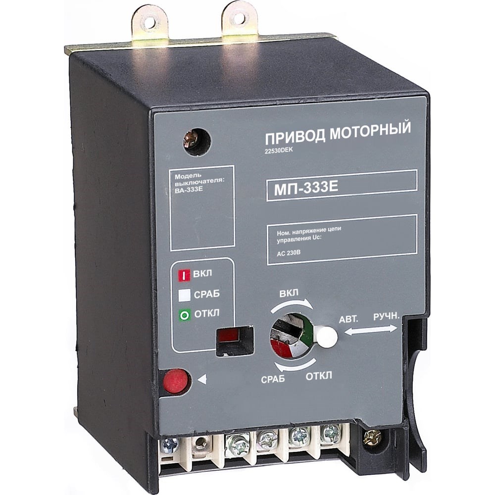 Моторный привод МП-330Е предназначен для дистанционного включения и выключения автоматических выключателей серии ВА-330Е. Моторный привод устанавливается на фронтальную часть автоматического выключателя и жестко связывает механизм моторного привода и рукоятку автоматического выключателя (для ВА-338Е - внутренняя установка). При подаче сигнала включения или отключения, механизм переводит рукоятку автоматического выключателя в положение «вкл» или «откл».