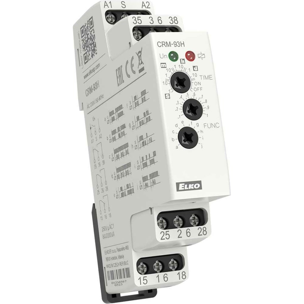 Дополнительные технические характеристики мультифункционального реле времени ELKO EP CRM-93H/230V 10 функций (0,1с -10 дней) AC 230V 00000000234: 5 временных функций, управляемых напряжением питания. 4 временных функции, управляемые со специального входа. 1 функция реле памяти (импульса) Удобная и наглядная настройка функций и временных диапазонов проводится поворотными переключателями. Настраиваемое время от 0.1 с до 10 дней разделено на 10 диапазонов (0,1 с - 1 с/1 с - 10 с/0,1 мин - 1 мин/1 мин - 10 мин/0,1 ч - 1 ч/1 ч - 10 ч /0,1 дня - 1 день/1 день- 10 дней/только ON/только OFF). Защита IP40 со стороны лицевой панели/IP20 клеммы.