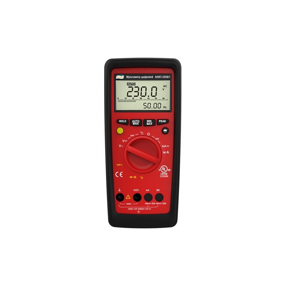 Мультиметр цифровой АКИП-2208/1При нажатии кнопки min/max мультиметр начнет записывать минимальные и максимальные показания. Все функции могут измерять MIN/MAX, кроме функций Hz/Duty. При нажатии кнопки "HOLD" можно удерживать текущее отображаемое значение измерения, при этом на дисплее одновременно отображается надпись "HOLD".Мультиметры измеряют температуру с помощью термопары типа " K " (Ni Cr-Ni) в диапазоне от 0 до +1300 градусов Цельсия.Аналоговая шкала обновляется со скоростью 28 раз/сек.При нажатии и удержании кнопки PEAK и последующем нажатии кнопки AUTO/MAN выполняется коррекция нуля и измеряется относительная величина.Автоматическая система блокировки клемм предотвращает неправильное подключение тестового провода и неправильный выбор измеряемой величины, что обеспечивает безопасность пользователя.В режиме AUTO прибор автоматически выбирает диапазон с наилучшим разрешением в зависимости от подаваемого сигнала. В ручном режиме диапазон выбирается пользователем с помощью клавиши AUTO/MAN.Предусмотрена проверка полярности диодов, а также проверка на короткое замыкание и обрыв цепи. Помимо индикации на дисплее, сопротивление менее 30 Ом (приблизительно) индицируется звуковым сигналом.