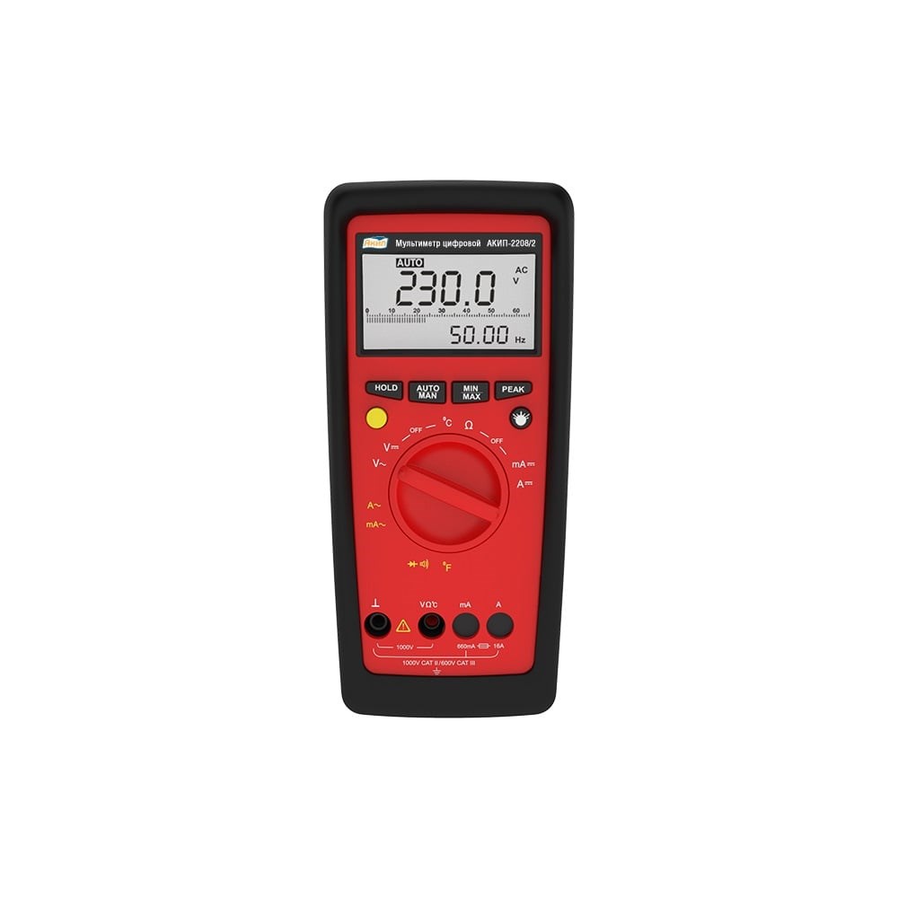 Мультиметр цифровой АКИП-2208/2При нажатии кнопки min/max мультиметр начнет записывать минимальные и максимальные показания. Все функции могут измерять MIN/MAX, кроме функций Hz/Duty. При нажатии кнопки "HOLD" можно удерживать текущее отображаемое значение измерения, при этом на дисплее одновременно отображается надпись "HOLD".Мультиметры измеряют температуру с помощью термопары типа " K " (Ni Cr-Ni) в диапазоне от 0 до +1300 градусов Цельсия.Аналоговая шкала обновляется со скоростью 28 раз/сек.При нажатии и удержании кнопки PEAK и последующем нажатии кнопки AUTO/MAN выполняется коррекция нуля и измеряется относительная величина.Автоматическая система блокировки клемм предотвращает неправильное подключение тестового провода и неправильный выбор измеряемой величины, что обеспечивает безопасность пользователя.В режиме AUTO прибор автоматически выбирает диапазон с наилучшим разрешением в зависимости от подаваемого сигнала. В ручном режиме диапазон выбирается пользователем с помощью клавиши AUTO/MAN.Предусмотрена проверка полярности диодов, а также проверка на короткое замыкание и обрыв цепи. Помимо индикации на дисплее, сопротивление менее 30 Ом (приблизительно) индицируется звуковым сигналом.