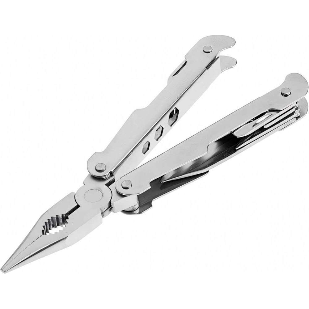 Функцииплоскогубцы, кусачки, консервный нож, адаптер для бит и головок, приспособление для чистки рыбы, линейка, пилка, ножи (малый и большой), отвёртки шлицевые (малая и большая), открывашка для бутылок