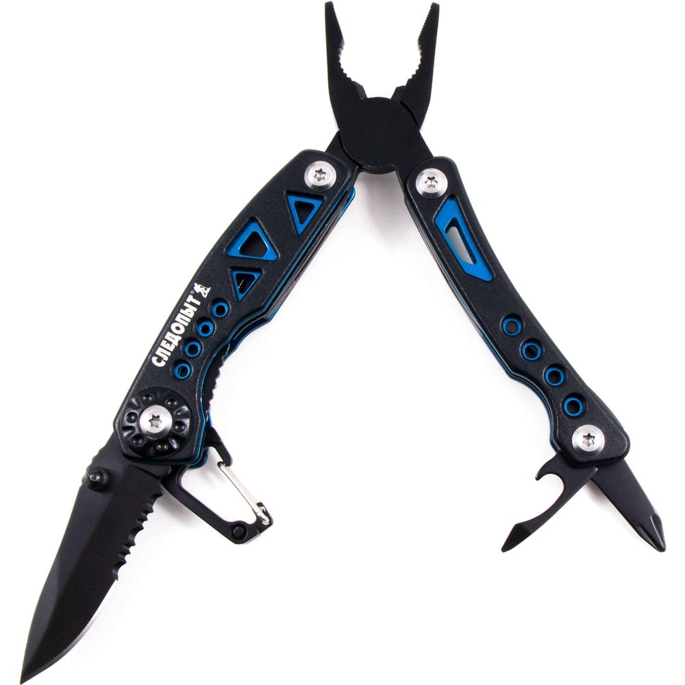 Функциитонконосые плоскогубцы, плоскогубцы, резак для проволоки, нож с серрейтором, карабин, открывашка для бутылок и плоская отвёртка, отвёртка крестообразная