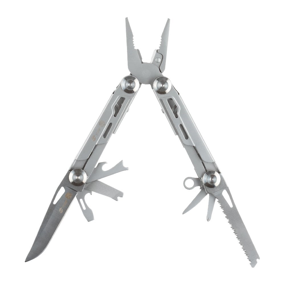 Функции: Острогубцы; Пассатижи; Кусачки; Нож большой; Отвертка крестовая; Отвертка шлицевая; Открывалка для бутылок; Консервный нож; Пила; Инструмент для снятия изоляции; Шило; Отропорез.