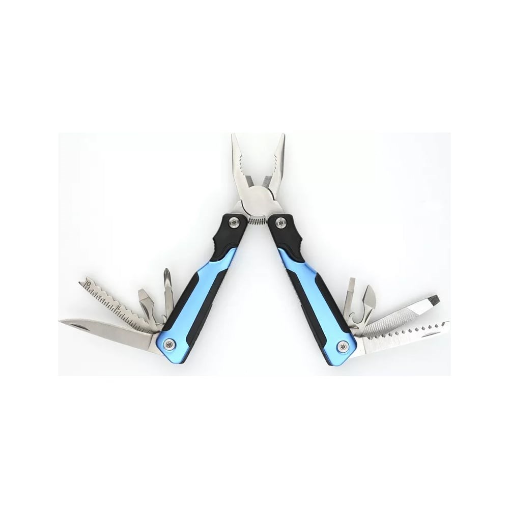 Количество функций - 15: - плоскогубцы - пассатижи - кусачки - нож плоский большой - отвертка крестовая - линейка - открывалка для бутылок - открывалка для консервов - инструмент для зачистки проводов - пила по дереву и металлу - отвертка плоская - отвертка шлицевая маленькая - напильник по дереву и металлу - скайдер для чистки рыбы - шило