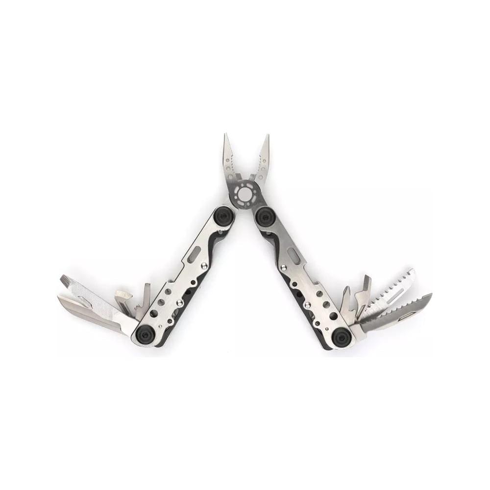 Количество функций - 13: - острогубцы - пассатижи - кусачки - нож плоский большой - пила по дереву и металлу - отвертка крестовая - отвертка шлицевая маленькая - отвертка шлицевая большая - зачистка провода - открывалка для бутылок - открывалка для консервов - напильник по дереву и металлу - нож серрейторный