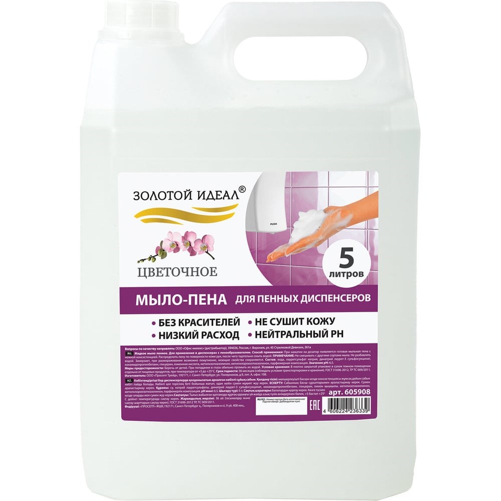 Жидкое мыло-пена ЗОЛОТОЙ ИДЕАЛ идеально подходит для использования в офисах, отелях, ресторанах и других общественных местах.Средство универсального применения отлично очищает и смягчает кожу, обеспечивает уход и увлажнение, обладает приятным ароматом эфирных масел. Подходит для всех типов кожи и не содержит формальдегида. Большого объема 5 л хватит надолго, что позволит сэкономить время и средства. При необходимости можно перелить во флакон с дозатором.Способ применения: при нажатии на дозатор/срабатывании сенсора появляется готовая мыльная пена с нежной консистенцией. Распределить пену по поверхности кожи рук, после чего тщательно смыть водой.Примечание: не смешивать с другими сортами мыла. Не разбавлять водой.Соответствует ГОСТ 31696-2012.Условия хранения: хранить при комнатной температуре.Избегать попадания прямых солнечных лучей.Срок годности – 24 месяца.