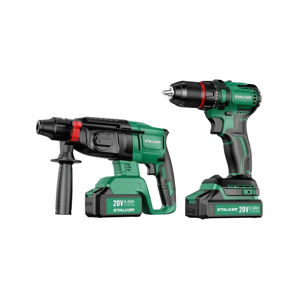 Бесщеточная аккумуляторная дрель-шуруповерт STALKER D20 Li BL- применяется для создания отверстий и закручивания крепежей при работе с деревянными, металлическими и пластиковыми конструкциями. Бесщеточный тип двигателя обеспечивает высокую производительность и долгий срок службы. Благодаря быстрозажимному патрону обеспечивается удобная замена и надежное крепление оснастки. Регулируемая скорость помогает подобрать оптимальный режим в зависимости от задачи. Дрель-шуруповерт оснащен удобной прорезиненной рукояткой.Характеристики:Напряжение аккумулятора: 20 ВЕмкость аккумулятора: 2 АчТип двигателя: бесщеточныйМакс. количество оборотов: 1550 об/минМакс. крутящий момент: 38 НмБесщеточный аккумуляторный перфоратор STALKER RH20 Li BL- предназначен для сверления отверстий в различных материалах: дерево, сталь, бетон, кирпич и т.д. Имеет 3 режима работы: сверление, сверление с ударом, долбление + предустановка долота. Мощный бесщеточный двигатель обеспечивает высокую производительность и долгий срок службы. Светодиодная подсветка позволяет использовать инструмент в темных помещениях, обеспечивая хороший обзор места сверления.Характеристики:Напряжение аккумулятора: 20 ВЕмкость аккумулятора: 4 АчТип двигателя: бесщеточныйМакс. количество оборотов: 1400 об/минМакс. диаметр сверления буром (бетон): 20 мм