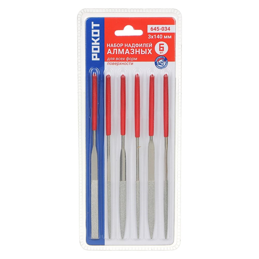 Набор алмазных надфилей 6шт РОКОТ размер 3x140мм, блистер 645-034 подходит для обработки деталей из различных материалов. Благодаря алмазному напылению эффективно снимает слой со стальных заготовок. Имеется рукоять из ПВХ на каждом надфиле для удобства удержания. Комплект поставляется в полупрозрачном пластиковом конверте.