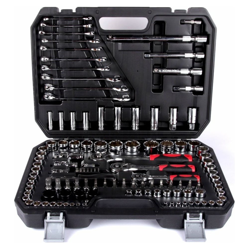 Набор автомобильного инструмента Dreamcar 120 шт. DC-000-0180303 подходит для профессионального использования в процессе ремонта неисправностей транспортных средств и других ремонтных работ. Рабочая часть всех инструментов выполнена из высокопрочной хромованадиевой и хромомолибденовой стали, что обеспечивает высокую прочность и долговечность инструмента. Рукоятки трещоток выполнены из полиэтилена ПНД высокой плотности, используемого в производстве пищевых ёмкостей и детских игрушек. Материал имеет приятную бархатистую поверхность на ощупь и минимальные выделения вредных веществ. Применение в производстве сырья высокого качества обуславливает прочность, стойкость к механическому воздействию (в том числе - ударам), долговечность и экологическую безопасность инструментов.