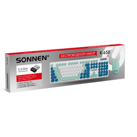 Набор беспроводной тихий: клавиатура 104 клавиши, мышь 4 кнопки 800/1200/1600 dpi, SONNEN K-650, белый / мятный / бирюзовый, 513953