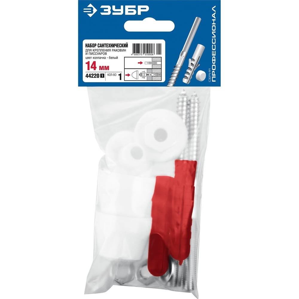 Набор для крепления раковин и писсуаров 14 мм, белый ЗУБР Профессионал 44220_z01 предназначен для крепления унитазов к бетонному или кирпичному основанию. Диаметр предварительного сверления: 14 мм.