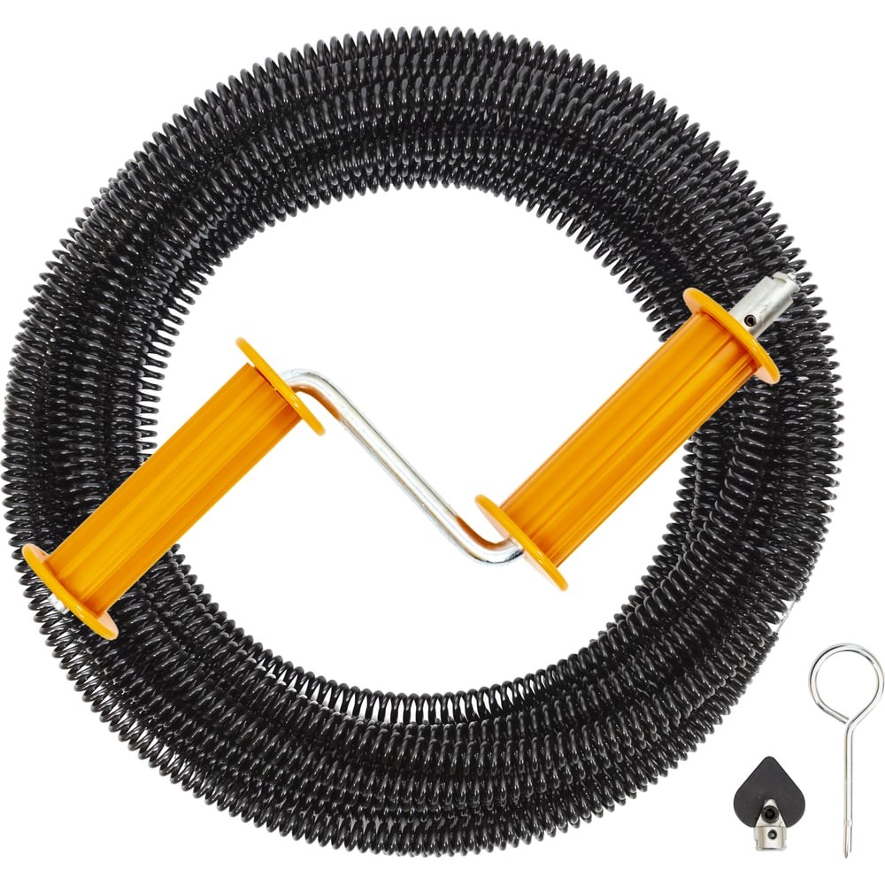 Набор для прочистки канализации КРОКОЧИСТ до 110 мм, 7 метров 51315-16-7Н содержит в себе все необходимое для удаления засора в канализации диаметром до 110 мм и длиной до 7 метров.Спирали сделаны из высокоуглеродистой стальной проволоки диаметром 3,2 мм +/-0,1 мм на пружинонавивочном станке ЧПУ с высокой точностью. Готовые спирали покрыты оксидированным защитным слоем. Быстроразъемные «Т» образные замки позволяют удобно нарастить необходимую длину спирали или сложить спирали после работы.Рукоятка присоединяется к спирали и позволяет оператору вращать спирали.Адаптер позволяет подключить аккумуляторный шуруповерт к спиралям, что увеличивает эффективность прочистки.Контейнер для переноски спиралей в этот набор не входит. Комплектуется дополнительно.Набор для прочистки канализации КРОКОЧИСТ можно дополнительно нарастить спиралями и дополнить насадками.