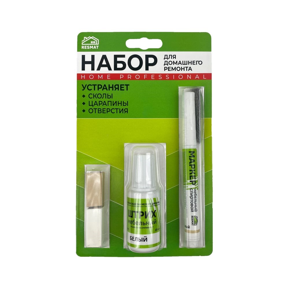 Набор для реставрации мебели, домашнего ремонта Resmat бежевый арт. 2911 включает в себя два восковых мелка 1х1х3 см, воск мягкий цвет бежевый и Бук натуральный, штрих мебельный бежевый 20 мл, мебельный спиртовой маркер 2 мл бук натуральный, пластиковый шпатель и стальная вата. Подходит для ремонта мебельных фасадов, дверей, плинтусов, столешниц, полов, подоконников и т.п. из МДФ, ЛДСП, фанеры, массива дерева, ламината, пластика, пробки. Воск предназначен для заделки глубоких и средних повреждений, сколов, царапин, трещин, вмятин на поверхностях, не подверженных интенсивной эксплуатации Штрих используют для мелкого ремонта мебели, реставрации повреждений, для заполнения малых и средних повреждений, устраняет сколы, царапины, стыки, проколы, швы Маркер служит для закраски царапин и потертостей на мебели Стальная вата нужна для полировки поверхности мебели, удаления остатков реставрационных материалов Поставляется в блистерной упаковке, размер 20х12х4 см, вес 65 г.