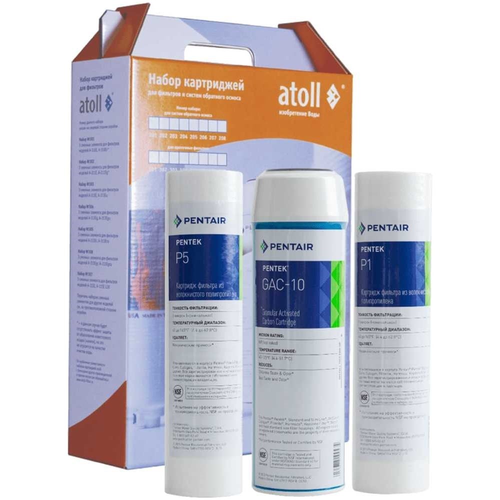 Набор картриджей atoll №202 STD это комплект префильтров для пятиступенчатых систем обратного осмоса atoll A-550 STD, A-550m STD, A-550p STD, а также более старых моделей А-560, А-560Е и их модификаций с повысительным насосом.В состав комплекта входят три картриджа формата Slim Line 10 дюймов производства компании PENTAIR.В Набор №202 STD входят:префильтр механической очистки из полипропилена Pentek P5, степень очистки — 5 мкм;угольный сорбционный префильтр Pentek GAC-10, фильтрующий материал — гранулированный активированный уголь;префильтр тонкой механической очистки из полипропилена Pentek P1, степень очистки — 1 мкм.Рекомендуемая периодичность замены Набора картриджей №202 STD —каждые 6 месяцев.