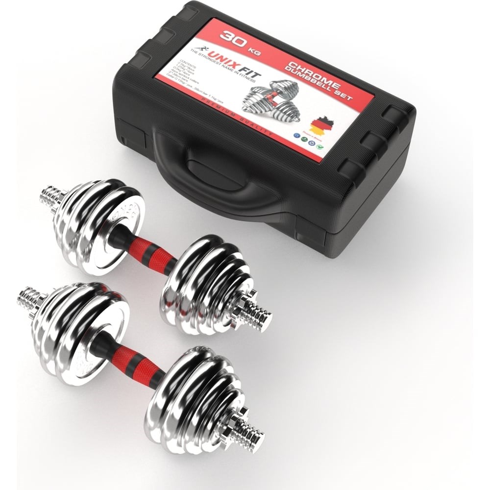 Набор гантелей в кейсе UNIXFIT 30 кг DBKITU30 состоит из двух гантелей общим весом 30 кг. Удобная разборная конструкция позволяет регулировать вес гантелей в процессе занятий, а обрезиненная рукоятка сделает тренировку комфортной.